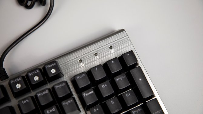 键盘的正面盖板采用了整块的金属合金,并且经过了金属拉丝处理,视觉感受上非常不错的,还有就是键盘按键采用了悬浮式设计,十分酷炫。