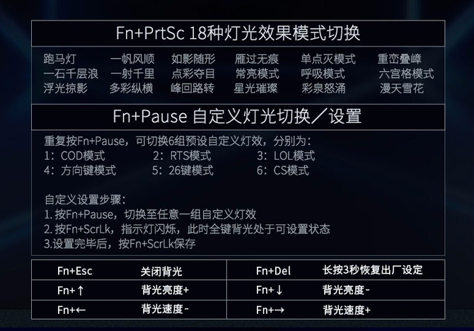除此之外,作为一款针对电竞玩家的机械键盘,光效当然也是必不可少的了,这款机械键盘拥有冰蓝单色背光系统,并且有18中预设光效,很多的玩法,让我们拥有更多的使用乐趣。