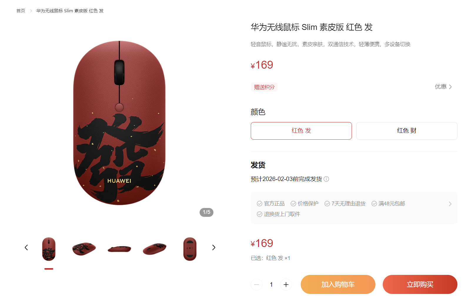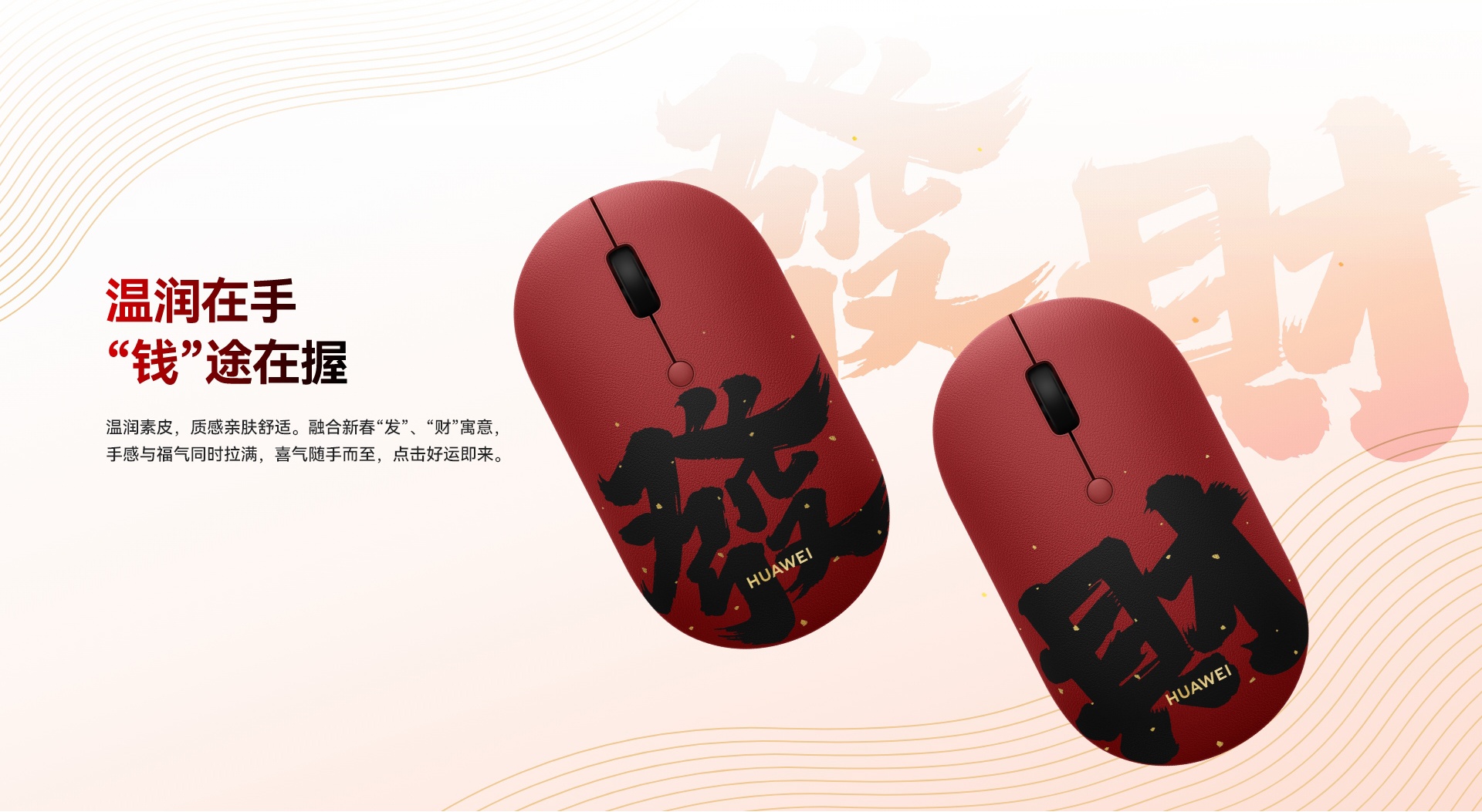 1月27日消息,春节将至,华为上架一款专为新春打造的无线鼠标Slim素皮版,以喜庆外观、亲肤质感与强劲性能,为消费者的节日数码装备增添一抹福气。该产品现已在华为商城和京东等平台上架,提供“发”“财”双字专属版本,定价169元,现在下单,预计将于2月3日前完成发货。